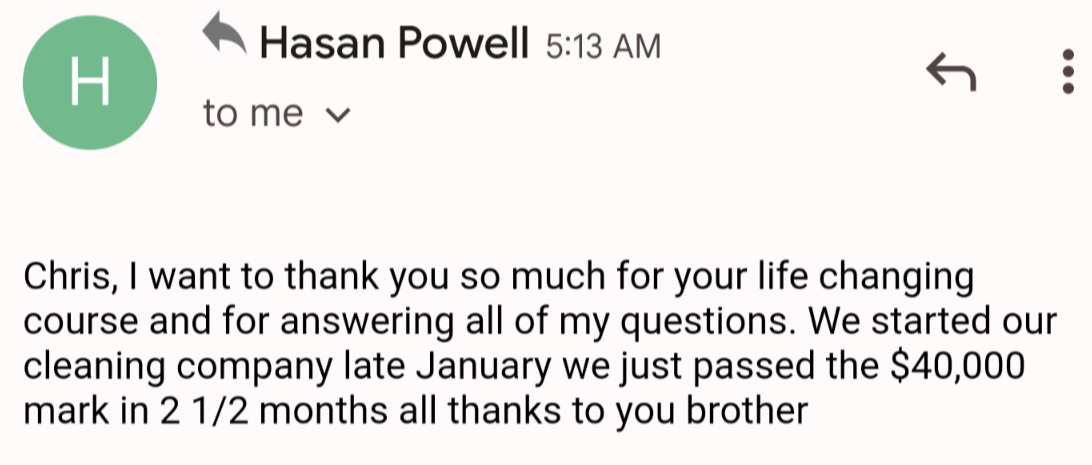 As long as you follow the steps inside of the training, your first few cleanings will more than pay for this entire course! Based on industry averages, if we helped you book ONLY 1 Standard Clean, 1 Deep Clean, and 1 Moving Clean, the course has already paid for itself. Most people we've spoken to that have actually implemented what they learned are quickly hitting $10k in their first month of business and some are even making over $400k in their first year. The key is to take action and not just consume the content. If you look at it this way, you're paying pennies for a course that can generate serious, lasting wealth. We're not guaranteeing that you will make this much as we cannot control what you decide to do and not do in your business!